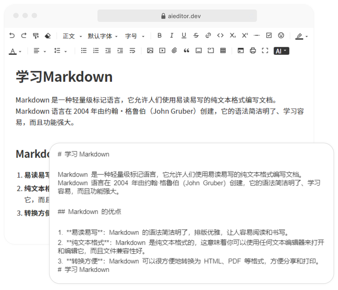 | 框架支持 | 特定少量框架 | AIEditor 基于 Web Component 开发,支持任意框架 |