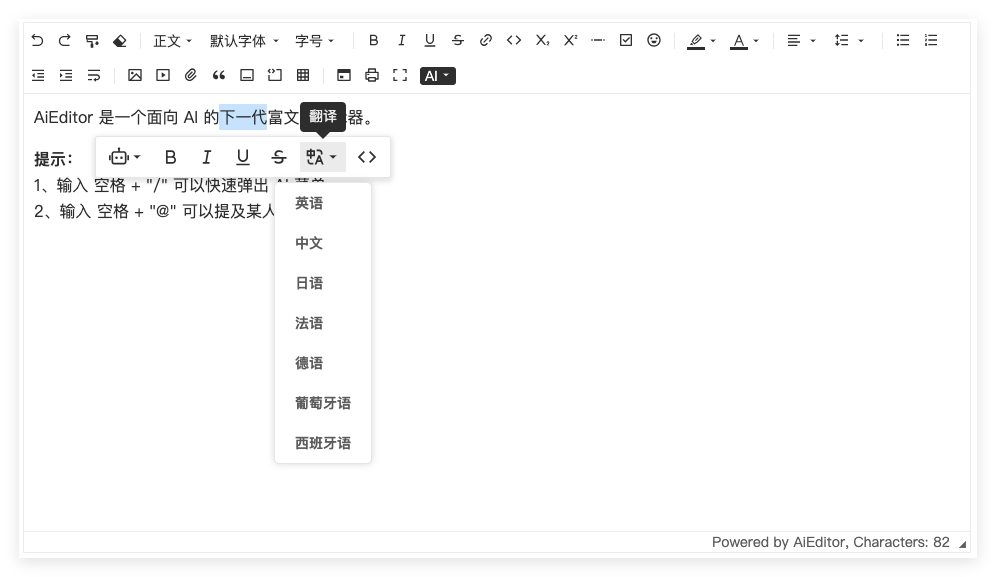AI 翻译指的是选择一段文字后,可以对其内容进行翻译。如下图所示: